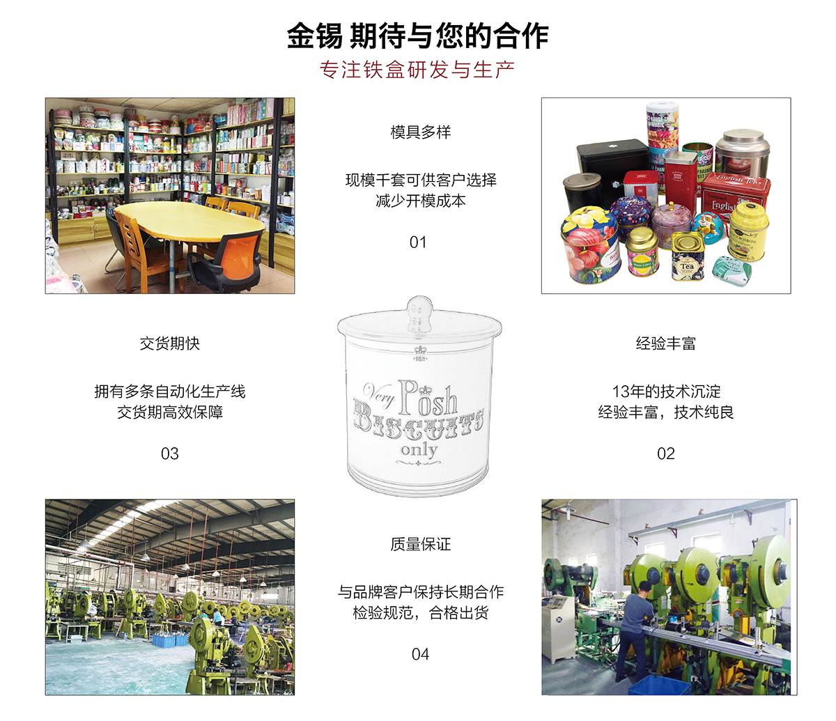 廣州市金錫五金制品有限公司成立于2016年,是已有13年生產(chǎn)經(jīng)驗(yàn)的實(shí)力廠家。我廠是專業(yè)定制優(yōu)良馬口鐵盒、鐵罐、禮品盒、茶葉罐、月餅盒等金屬鐵盒包裝的制罐企業(yè),我們擁有超過6000平方米的標(biāo)準(zhǔn)現(xiàn)代化廠房及八條生產(chǎn)線。公司集產(chǎn)品研發(fā)、設(shè)計、生產(chǎn)、銷售于一體,技術(shù)優(yōu)良,實(shí)力雄厚。通過十多年的制罐經(jīng)驗(yàn),我們擁有專業(yè)的技術(shù)團(tuán)隊,嚴(yán)格的作業(yè)流程、完整的品質(zhì)保障體系、完善的銷售以及售后服務(wù)系統(tǒng)。